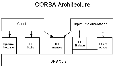 The client side architecture provides clients with interfaces to the ORB and object implementations. In consists of the following interfaces : Dynamic Invocation - This interface allows for the specification of requests at runtime. This is necessary when object interface is not known at run-time. Dynamic Invocation works in conjunction with the interface repository. IDL Stub - This component consists of functions generated by the IDL interface definitions and linked into the program. The functions are a mapping between the client and the ORB implementation. Therefore ORB capabilities can be made available for any client implementation for which there is a language mapping. Functions are called just as if it was a local object. ORB Interface - The ORB interface may be called by either the client or the object implementation. The interface provides functions of the ORB which may be directly accessed by the client (such as retrieving a reference to an object.) or by the object implementations. This interface is mapped to the host programming language. The ORB interface must be supported by any ORB.